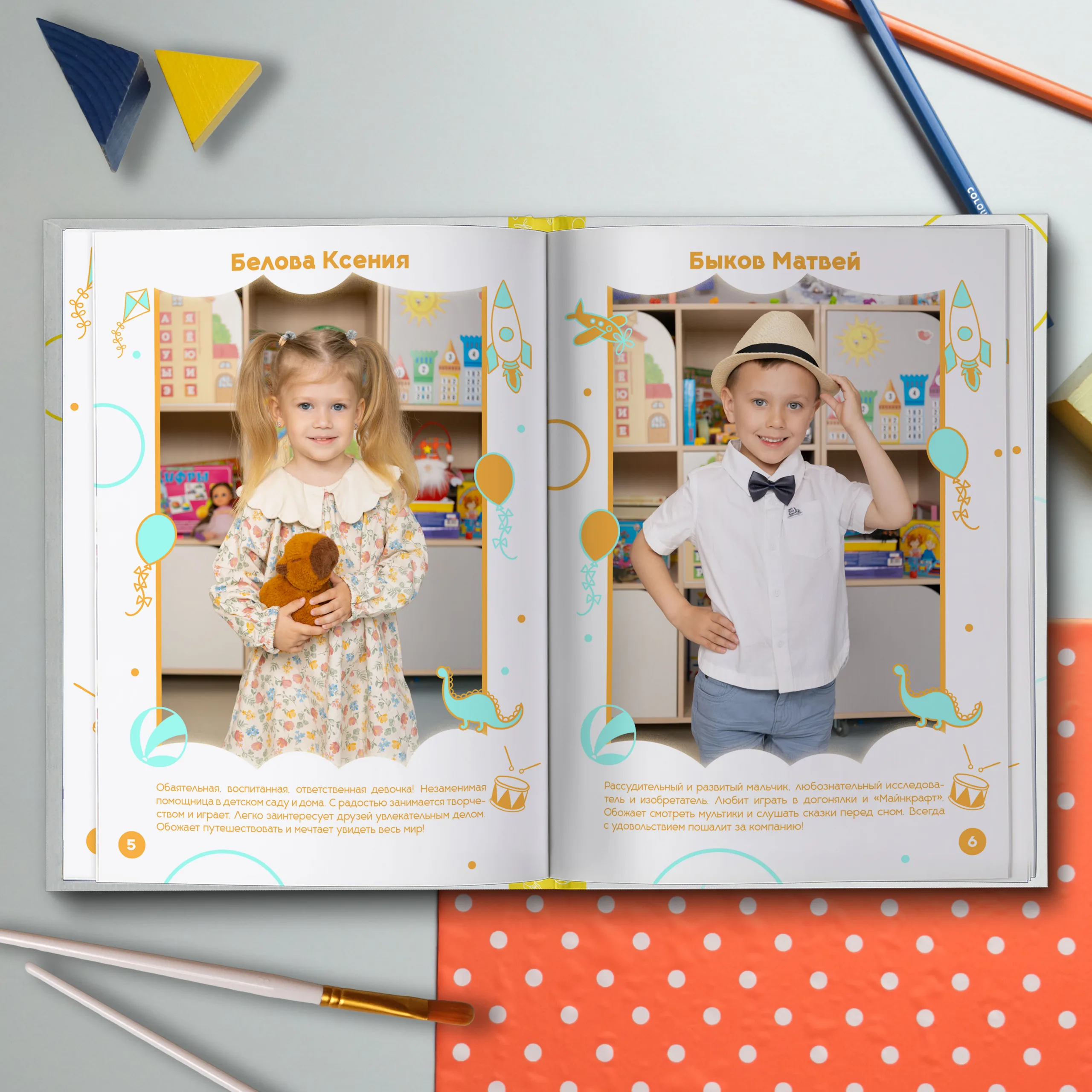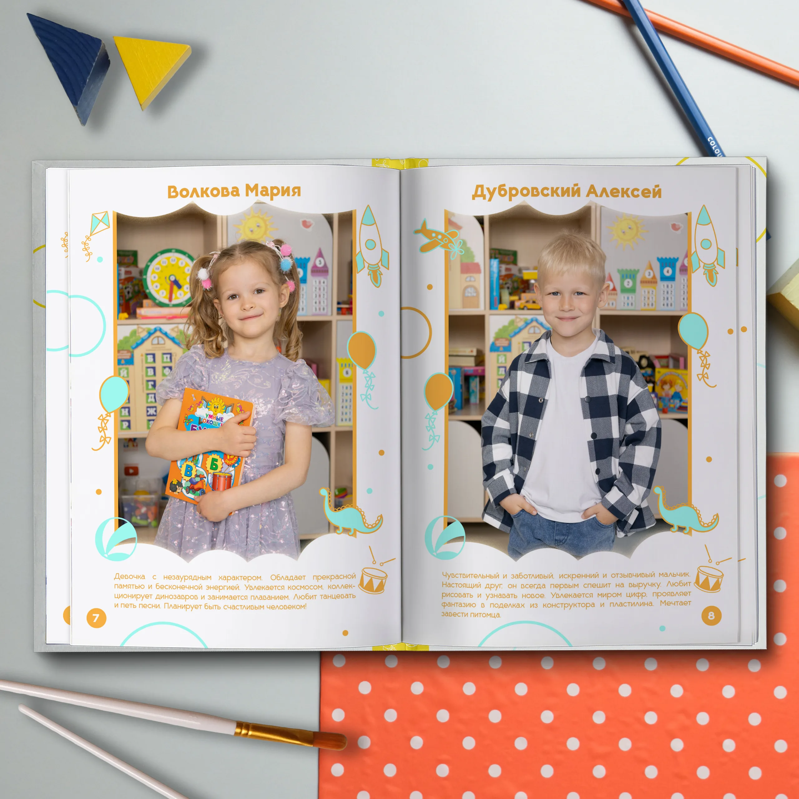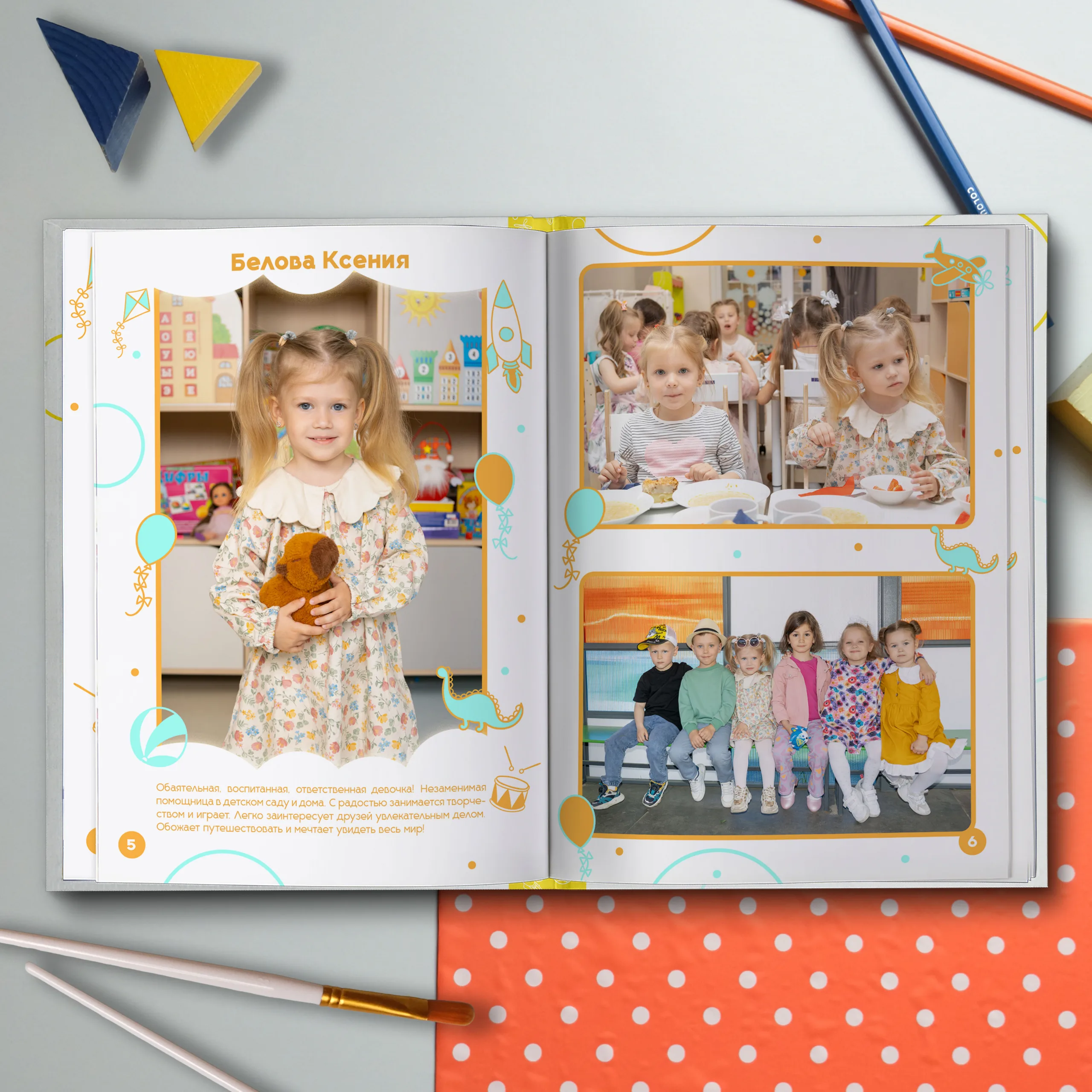 3ий разворот и далее — личные страницы выпускников (портретная фотография и 2 фотографии личного репортажа)