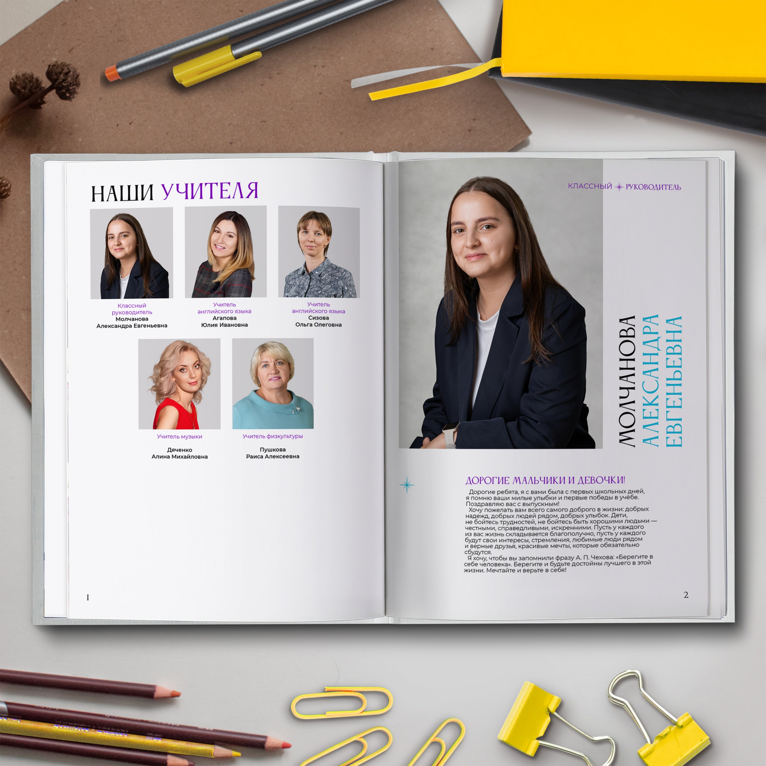 1ый разворот — виньетки педагогов и фотография классного руководителя с напутственным словом
