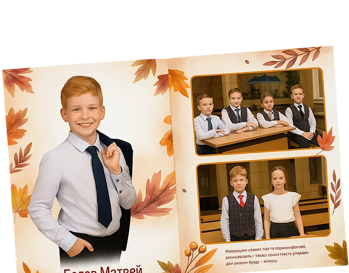 У нас есть 9 вариантов макета на выбор, включая форматы «Произведение», «Призвание», «Мечта», «Эксклюзив» и другие. Все шаблоны включают портрет ученика, коллективное фото класса и снимок с классным руководителем. Также вы можете предложить свой собственный дизайн.